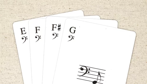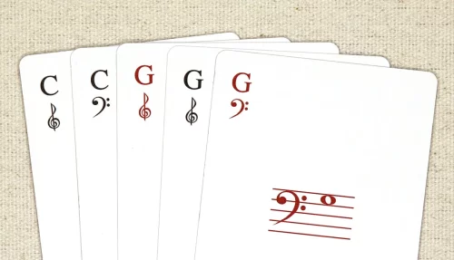 Play Music Cards is an innovative deck built around the grand staff, featuring 4 octaves across treble and bass staves. Red and black octaves in each clef form four suits—mirroring a traditional deck—with each card displaying a range of musical data: clef, pitch name, enharmonic equivalents, and rhythmic values (whole, half, quarter, and eighth notes).